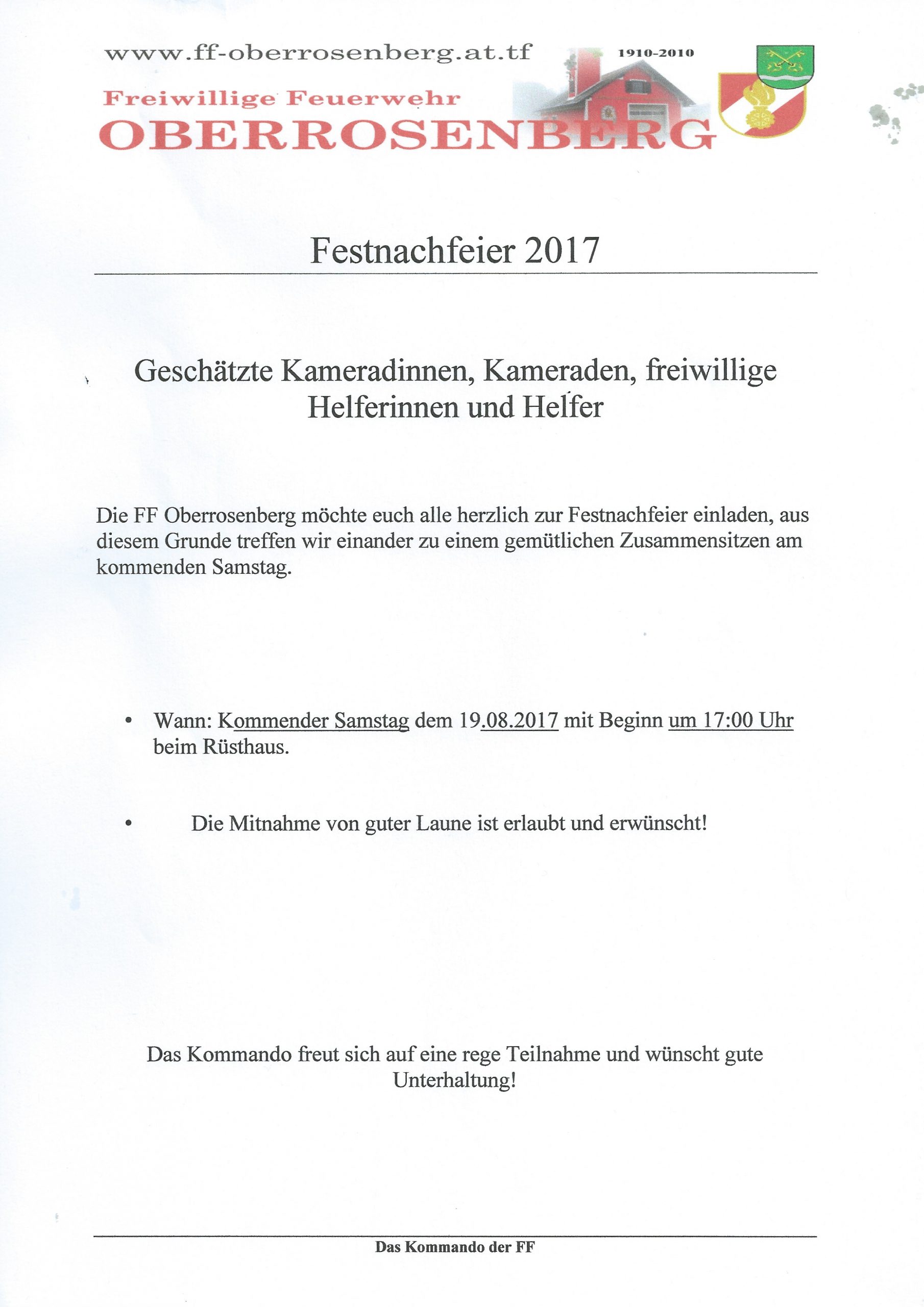 Wir laden herzlich zur Festnachfreier ein. Am Sonntag 19.08.2017 um 17:00 Uhr